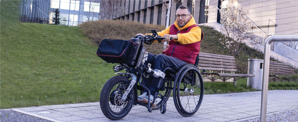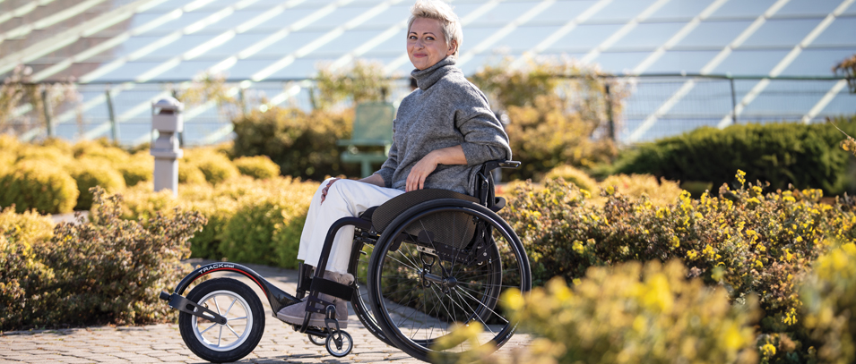 ¡Transforme su silla de ruedas en un triciclo deportivo y experimente una nueva sensación de velocidad y libertad! La rueda delantera para exteriores TRACK WHEEL es la compañera ideal para excursiones por la ciudad, el bosque o la playa: ultraligera, fácil de acoplar y cómoda. TRACK WHEEL está disponible en dos innovadores sistemas de acoplamiento: Single Arm con un dispositivo de sujeción y Double Arm con un dispositivo de sujeción doble. Elija la variante adecuada para su modelo de silla de ruedas.