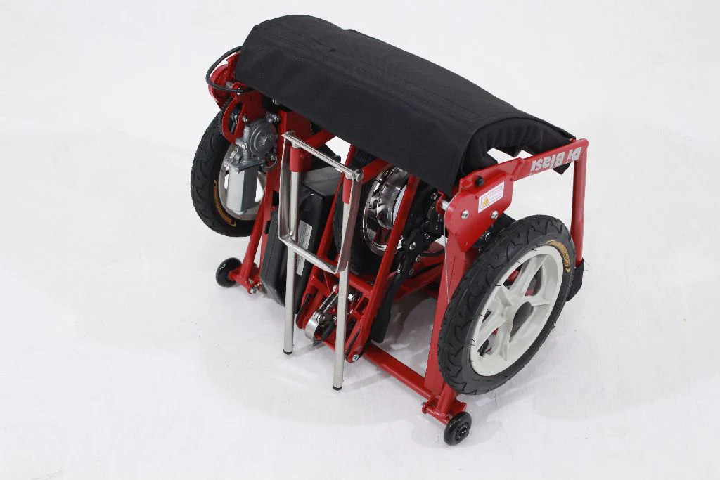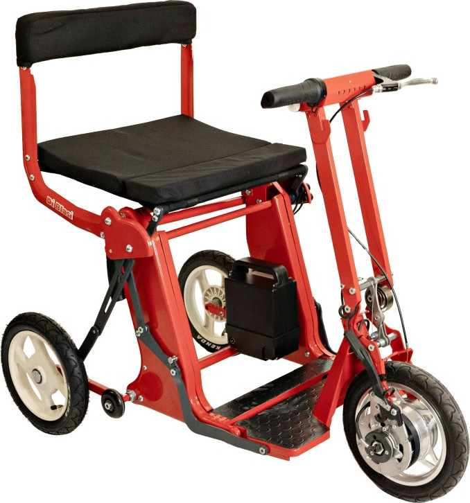 Práctico y revolucionario, gracias a un botón se pliega hasta adquirir el tamaño de un trolley de viaje, pulsando otro botón se convierte de nuevo en un scooter normal, listo para su uso inmediato.