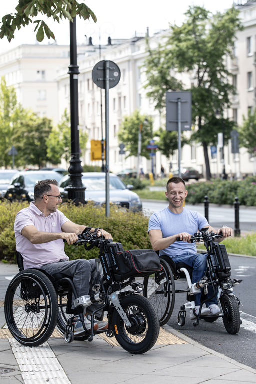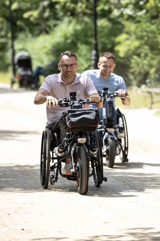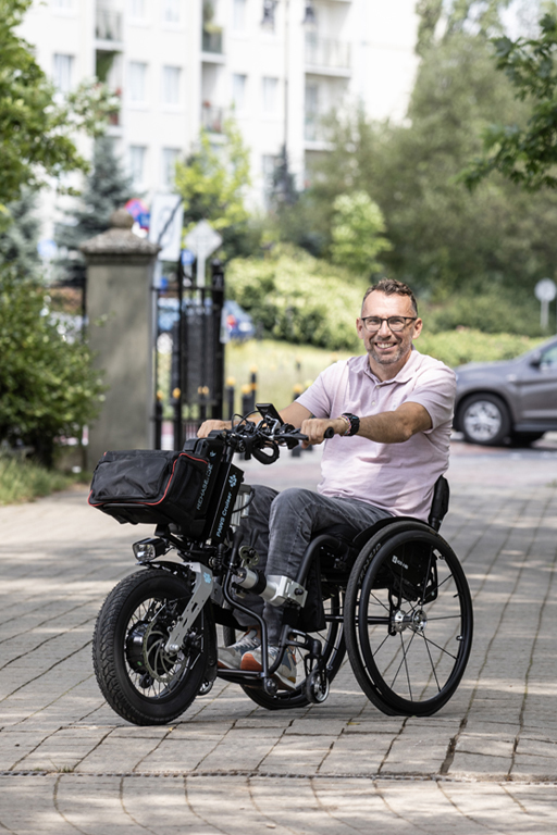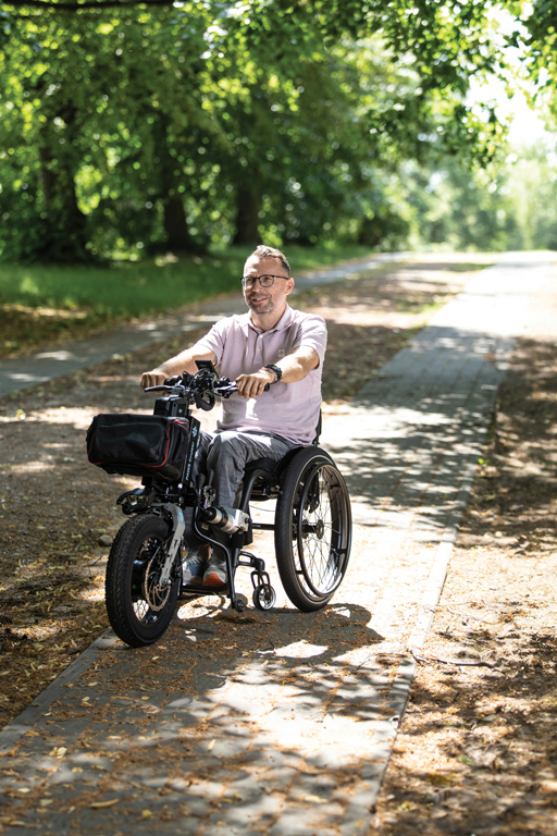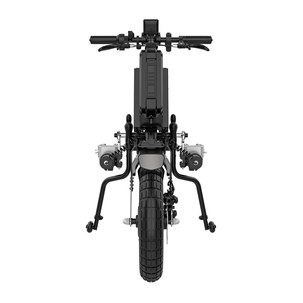 Este potente accesorio para sillas de ruedas manuales es versátil, tanto en la ciudad como en los senderos del bosque. La rueda motriz de 16 pulgadas le transporta con seguridad por terrenos ligeramente irregulares y le abre un nuevo mundo
